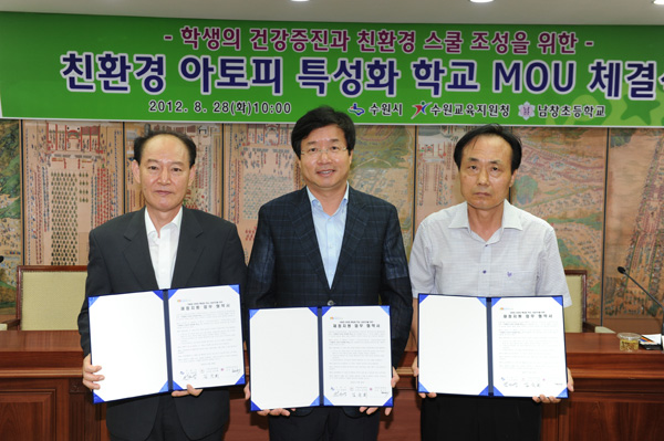 시는 지난 28일 염태영 수원시장과 김국회 수원시교육지원청장, 채근석 남창초 교장이 참석한 가운데 친환경 아토피 특성화 학교 MOU를 체결했다.