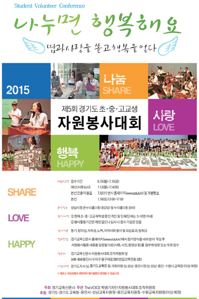 본사가 오는 7월 18일(토) 오후 1시부터 성남시청 1층 온누리홀(대강당)과 누리홀(1층 로비)에서 열리는 ‘제5회 경기도 초·중·고교생 자원봉사대회’ 참가 접수를 받고 있습니다. 이와 함께 행사를 도와줄 스태프·참관 학생도 접수합니다.