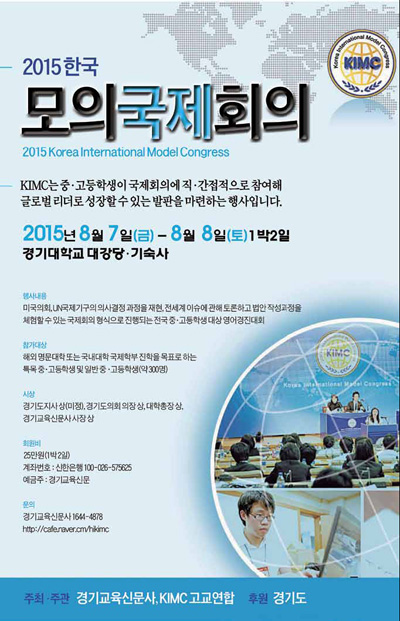 본사와 KIMC 고교연합이 주최·주관하고 경기도가 후원하는 2015 한국모의국제회의(KIMC, Korea International Model Congress)가 오는 8월 7~8일 수원 경기대학교 대강당에서 열린다. 미국의회와 UN국제기구(WEF, WHO, UNHRC 등)의 의사결정 과정을 재현하여 전 세계 이슈에 관해 토론하고 법안 작성 과정을 체험하는 모의 국제회의이다 .