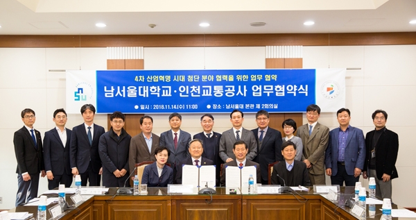 인천교통공사는 남서울대학교와 산학협력 업무협약을 14일 체결했다. 이날 양 기관은 협약을 통해 ▲첨단 분야 기술 및 인프라 교류 ▲미래 성장 동력원 발굴 및 지원 ▲IoT사물인터넷, 드론, 각종 빅데이터 등의 관리 지원 및 추진 ▲교육 및 인력 양성 등 4차 산업혁명 관련 분야에서 적극 협력해 나가기로 했다./박창우기자 pcw@