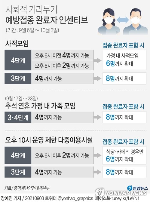 추석 연휴를 전후로는 가정 내 가족모임 시 4단계 지역에서도 예방접종 완료자를 포함해 최대 8명까지 모일 수 있다. 1차 접종자와 미접종자는 4명까지만 허용된다.