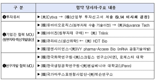 또 한국과 미국의 백신 관련 기업 및 연구기관 17곳이 백신 공동개발, 원부자재 공급 등에 협력하기로 했다.