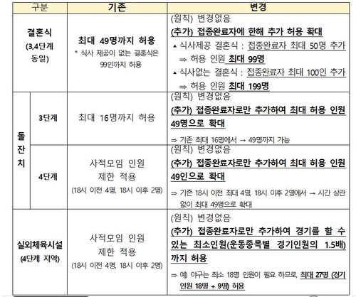 다만, 백신 접종률이 높아짐에 따라 접종 완료자에 대한 혜택(인센티브) 범위를 넓혀 3∼4단계라 하더라도 결혼식은 접종 완료자를 포함해 최대 199명, 돌잔치는 최대 49명까지 참석할 수 있게 바뀐다.