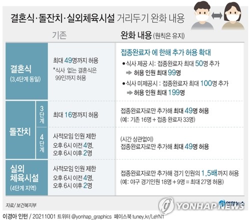 정부는 다만 결혼식과 돌잔치, 실외체육시설에 한해서는 인원 제한을 접종 완료자 중심으로 완화하기로 했다.