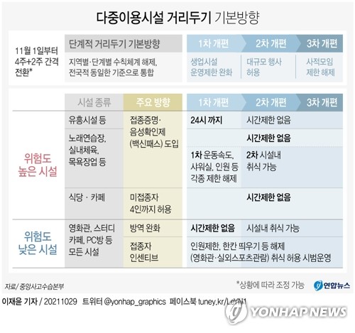 정부는 내달 1일부터 적용되는 1차 개편부터 유흥시설, 노래연습장, 실내체육시설, 목욕장업, 경마·경륜·경정·카지노 등 고위험시설 5종과 100명 이상이 모이는 행사, 요양병원·시설 면회 등에 '방역패스'(백신패스) 제도를 시행한다고 29일 밝혔다.