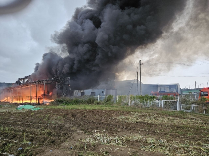 12일 소방당국에 따르면 오후 2시 9분쯤 화성시 정남면의 한 플라스틱 포장용기 보관 창고에서 불이 났다.