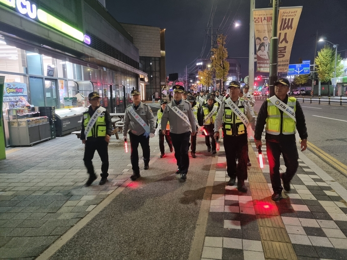 김한철 미추홀경찰서장이 지역 관서를 순회하는 방식으로 지역경찰 100여명과 협력단체원 300여명이 시·종점으로 도보 1시간 구간이나 되는 거리를 순찰하고 있다.