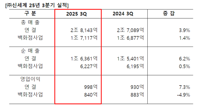 7일 ㈜신세계는 3분기 연결 기준 총매출 2조 8143억 원, 영업이익 998억 원을 기록했다고 밝혔다. 전년 동기 대비 매출은 3.9%, 영업이익은 68억원 증가했다.