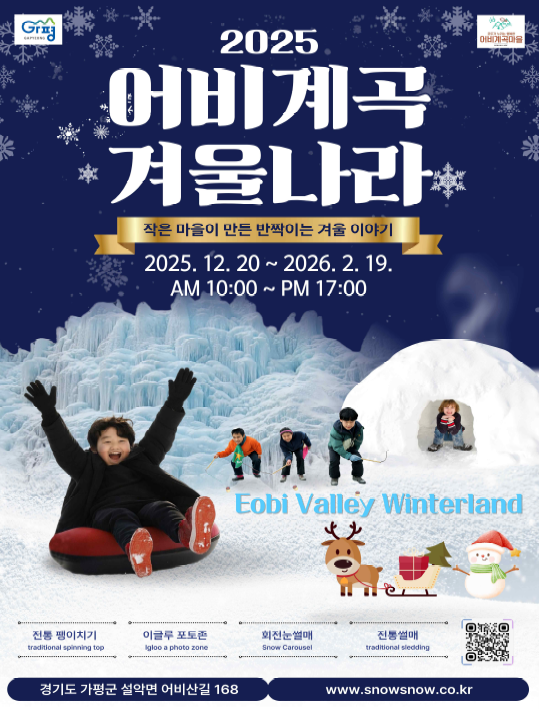 어비계곡 겨울나라 축제장에서는 전통팽이치기, 회전 눈썰매, 전통썰매, 이글루·빙벽 포토존 등 다양한 겨울체험이 마련돼 있다. 중식 후에는 베고니아새정원을 방문해 온실 그린하우스, 물의 정원, 미디어아트 인피니티존 등 이국적인 겨울정원을 둘러볼수 있다. 이어 스위스 풍 건축물이 조성된 '에델바이스 스위스 테마파크'에서 알프스 분위기를 체험하는 일정으로 마무리된다.