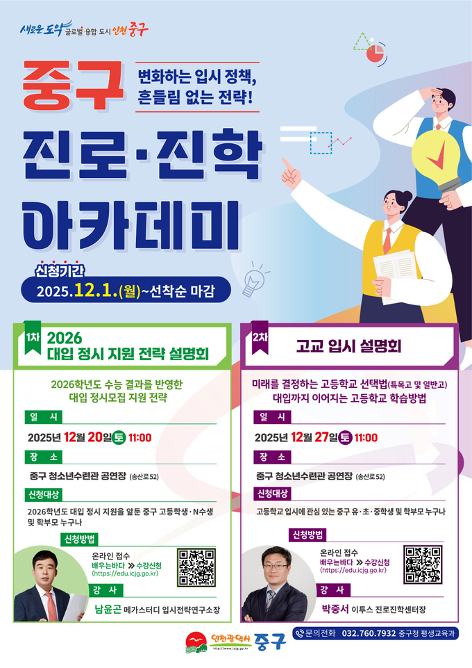 김정헌 구청장은 “영종국제도시는 교육열이 높고, 다양한 고등학교 선택지가 있는 만큼, 정확한 정보에 기반한 전략 수립이 무엇보다 중요하다"며 "이번 설명회가 학생·학부모들의 진학 고민을 조금이나마 덜어드리길 바란다”고 밝혔다.