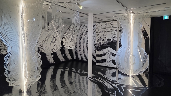특히 갈비뼈를 연상시키는 드로잉은 공간을 신체의 일부처럼 연결하며 전시장을 하나의 유기적인 몸으로 완성한다.