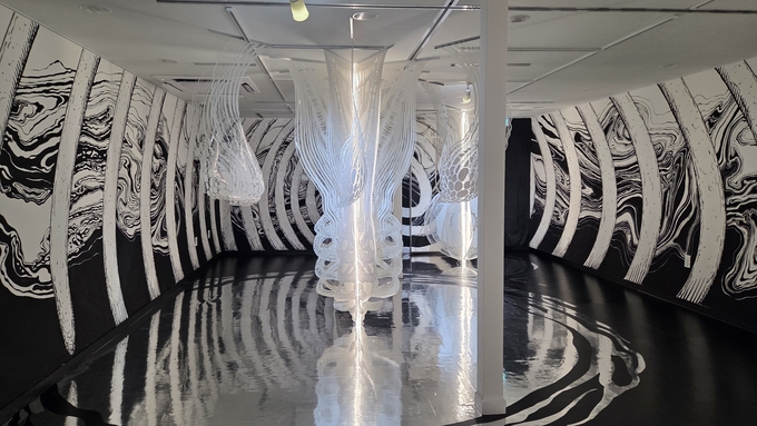 반투명한 설치물은 신비로움과 미지의 가능성, 긴장과 기대를 동시에 불러일으키며 공간 전체를 하나의 경계 위에 놓인 세계로 만든다.