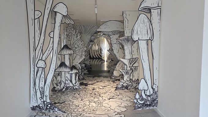 문턱을 지나 내부에는 중앙에 자리한 대형 설치 작품을 중심으로 숲속 버섯들이 자라고 사라지는 비밀스러운 생명의 시간이 펼쳐진다.