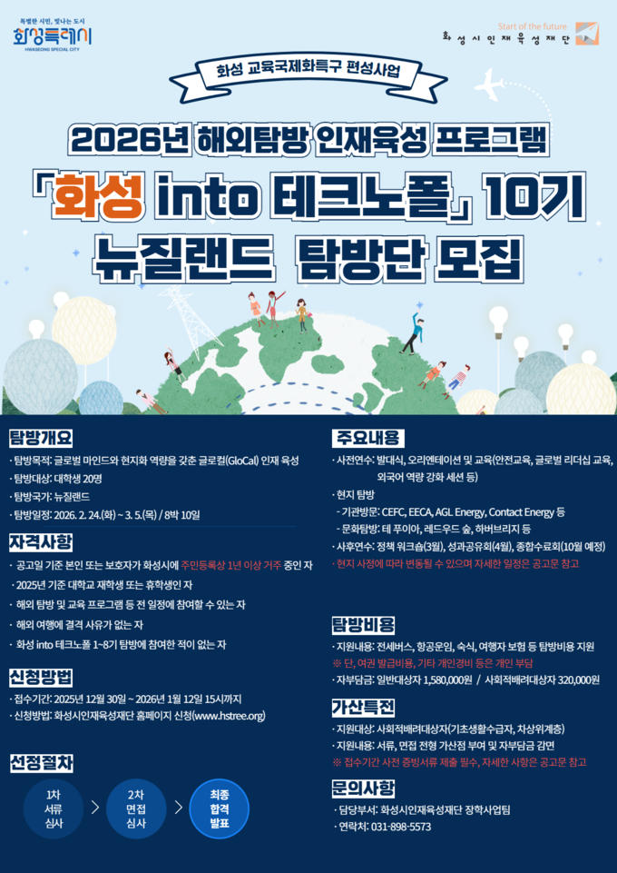 화성시인재육성재단은 2026년 상반기 해외 연수를 포함한 글로벌 인재 육성 프로그램 ‘화성 into 테크노폴’ 10기 뉴질랜드 탐방단을 공개 모집한다고 30일 밝혔다.
