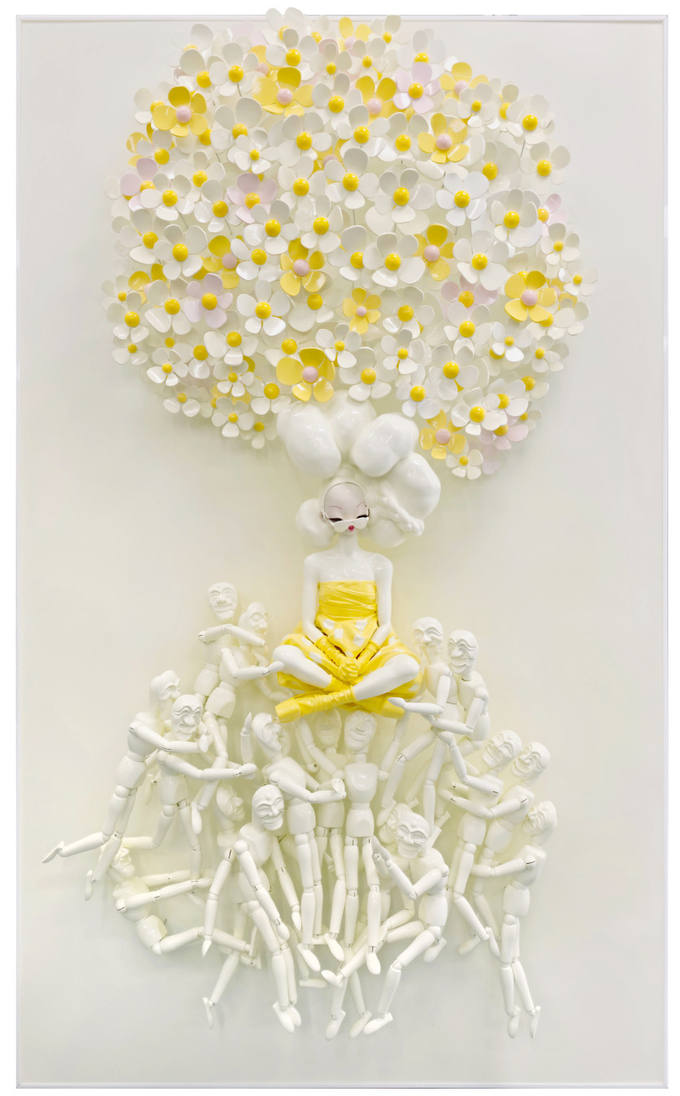 여기에 노란색 파스텔 톤의 포인트가 더해져 전체적으로 밝고 긍정적인 분위기를 자아내며 가채를 착용한 피규어와 나무 형태의 조형은 작품에 한국적인 정서를 더한다.