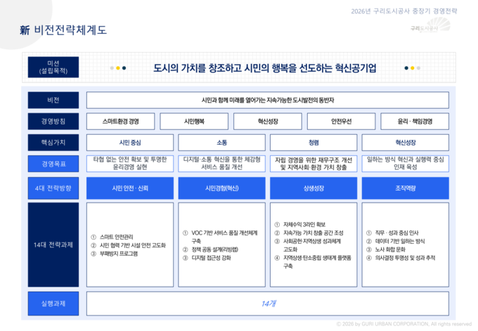 구리도시공사는 공사 미션인 도시의 가치를 창조하고 시민의 행복을 선도하는 혁신공기업 달성을 위한 2026년 중장기·ESG 통합 경영전략을 구리도시공사 최초로 수립했다고 28일 밝혔다.