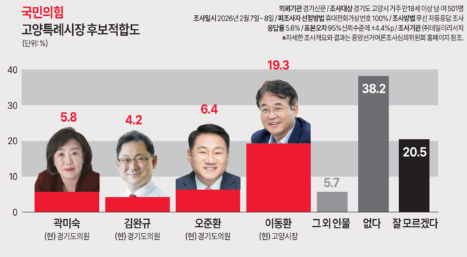 이동환 시장은 국민의힘 고양시장 후보 적합도 조사에서 19.3% 응답률을 보이며 오차범위 밖 1위를 기록했다.