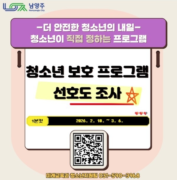 남양주시는 관내 청소년들의 안전과 권익을 보호하고, 수요에 기반한 실효성 있는 정책을 수립하기 위해 ‘청소년 보호 프로그램 선호도 조사’를 실시한다고 11일 밝혔다.