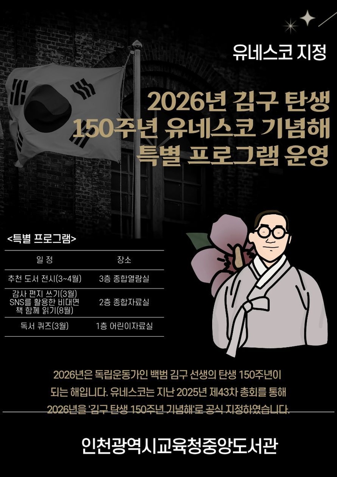 인천시교육청 중앙도서관은 ‘김구 탄생 150주년 유네스코 기념의 해’를 맞아 백범 김구 선생의 삶과 정신을 기리는 기념행사를 다음 달부터 8월까지 6개월간 운영한다고 23일 밝혔다.