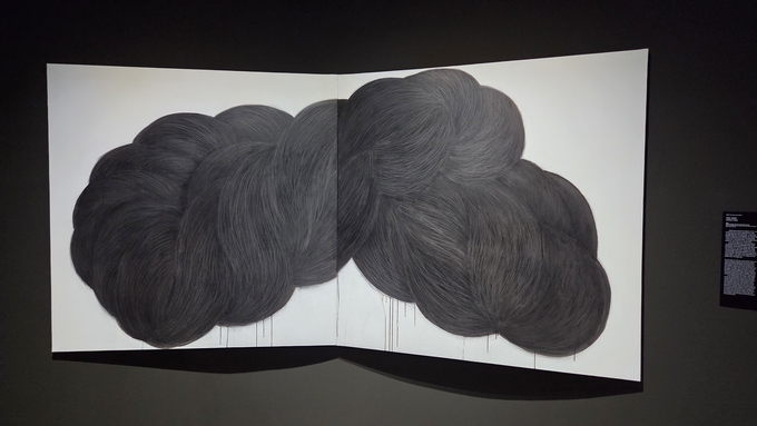 검은색 안료만을 사용한 작품은 다양한 재료를 사용해 빛의 결에 따라 달리 보이는 형상이 특징이다. 반복적인 선의 표현과 채도가 다른 먹색들이 레이어를 쌓으며 머리카락이라는 형상을 완성한다.