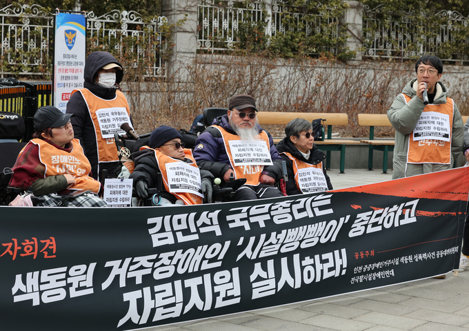 인천 중증장애인거주시설 색동원 성폭력사건 공동대책위원회는 지난 24일 서울 종로구 국무총리 공관 앞에서 기자회견을 열고 자립지원을 촉구했다.