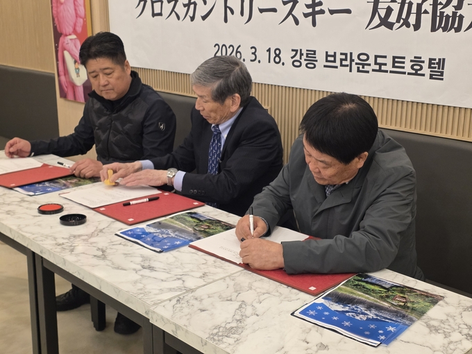 18일 강원 강릉시 브라운도트호텔에서 진행된 협약식에는 김남영 경기도스키협회장과 최준희 강원도스키스노보드협회장, 타카베 수지 히가시카와 국제 크로스컨트리 스키클럽 회장 등이 참석했다.
