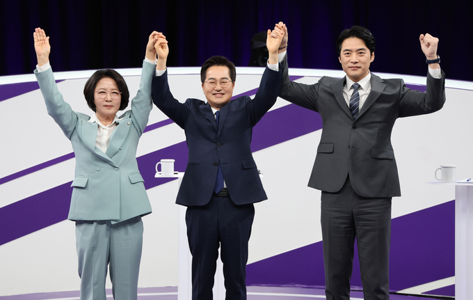 이날 한준호·추미애·김동연 후보(기호순)는 본격적인 토론에 앞서 공통 질문을 통해 긴장을 푸는 시간을 가졌다.