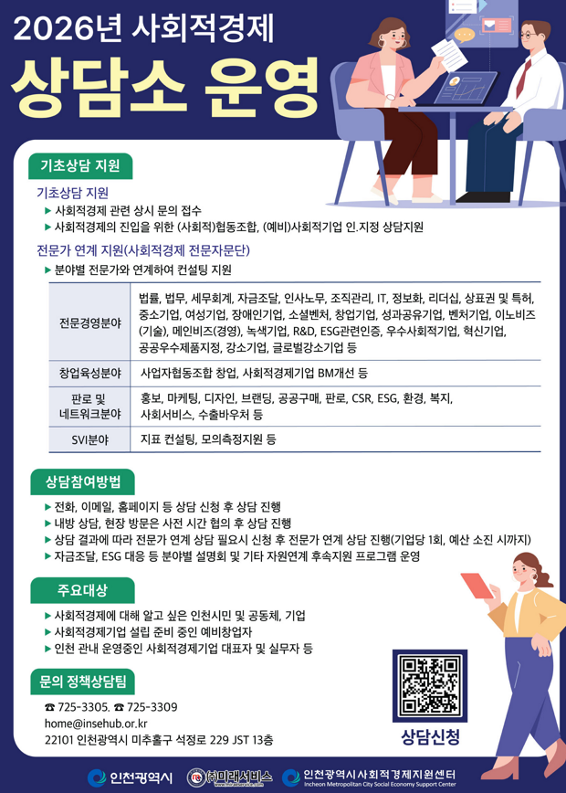 인천시는 지역 내 사회적경제 기업의 지속 가능한 성장과 자생력 강화를 위해 ‘2026년 사회적경제 상담소’를 연중 상시 운영한다고 밝혔다.