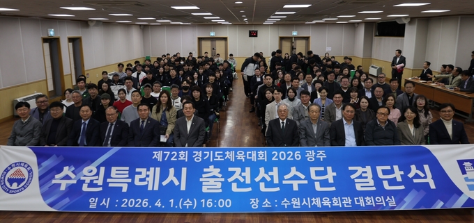 수원시체육회가 1일 시 체육회관 대회의실에서 ‘제72회 경기도체육대회 2026 광주’ 수원특례시 출전 선수단 결단식을 개최했다.