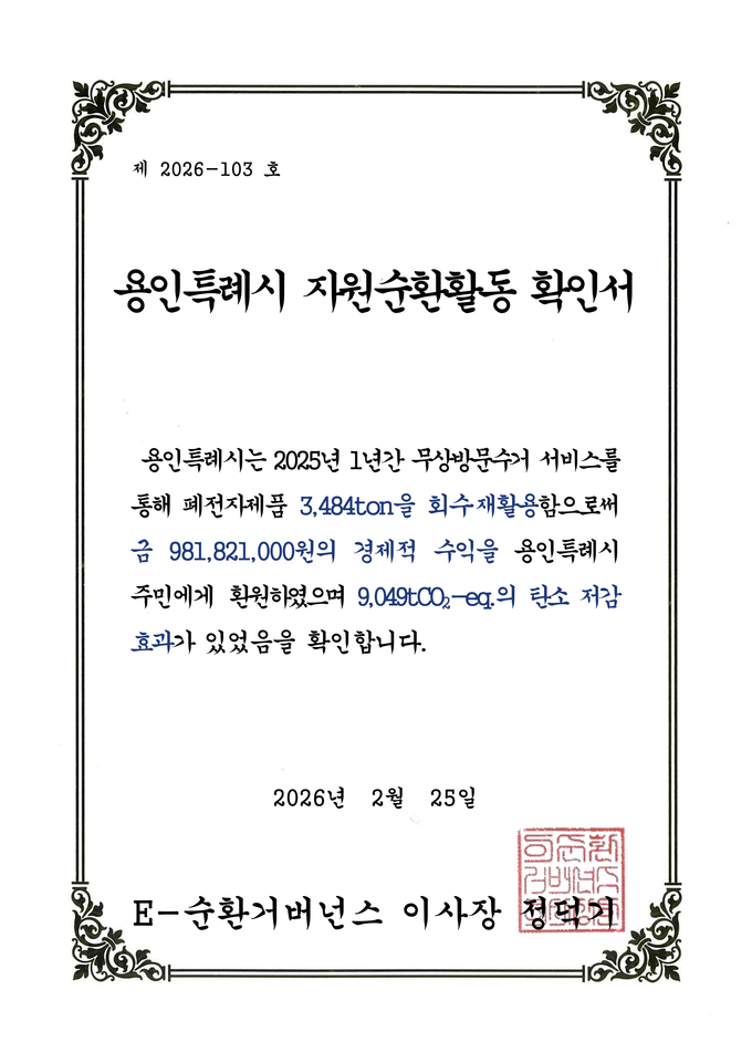 용인특례시는 '2025년 폐전자제품 무상방문수거 실적'에서 경기도 1위를 달성했다고 7일 밝혔다.