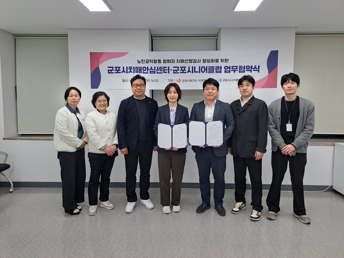 군포시치매안심센터는 최근 군포시시니어클럽과 업무협약을 체결하고 노인공익활동 참여자를 대상으로 한 치매선별검사 확대에 나선다고 13일 밝혔다.