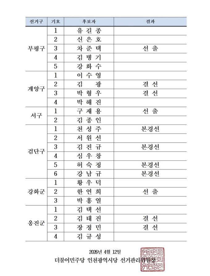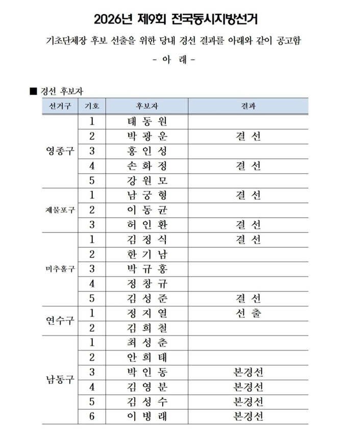 연수구에서는 정지열 후보가 당내 경선을 통해 최종 후보로 선출됐고, 부평구에서는 차준택 현 구청장이 과반 득표로 후보로 확정됐다. 서구에서는 구재용 후보가 본선 진출권을 따냈고, 강화군은 한연희 후보가 과반의 지지를 얻어 본선 후보로 결정됐다.