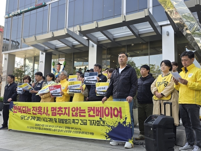 정의당과 민주노총 화섬식품노조 등은 13일 서울 서초구 SPC 본사 앞에서 기자회견을 열고 “반복되는 산재는 우연이 아니라 구조적 문제”라며 근본적인 안전대책 수립을 요구했다.