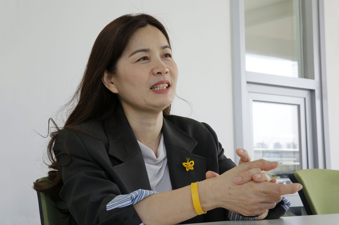 김 씨의 회색 자켓 한 켠에 직접 만든 노란 나비 배지가 달려 있었다.