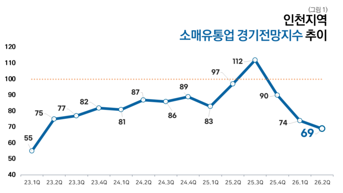 인천지역 내 대형마트, 슈퍼마켓, 편의점 등 65개 소매유통업체를 대상으로 실시한 ‘2026년 2분기 소매유통업 경기전망지수(RBSI)’ 조사 결과, 종합 지수는 69로 집계되며 기준치인 100을 크게 밑돌았다. 이는 2분기에도 경기 회복에 대한 기대감이 낮은 수준에 머물러 있음을 의미한다.