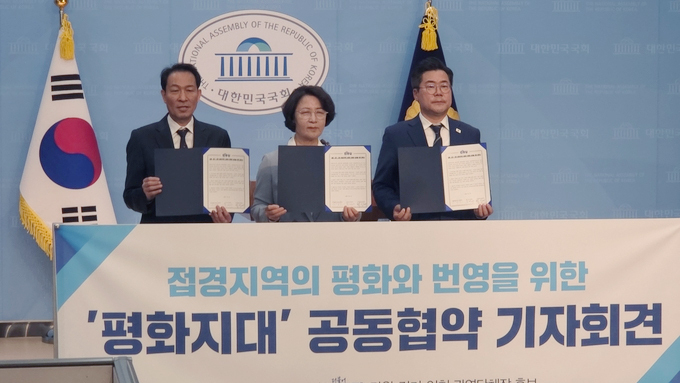 이들은 이날 국회 소통관에서 ‘접경지역을 하나의 평화와 번영을 위한 평화지대 공동 협약’을 체결했다. 경기·인천·강원 접경지역의 오랜 희생에 대한 보상과 지역 경제 활성화를 목표로 제도적 개선에 공동 대응하기로 뜻을 모았다.