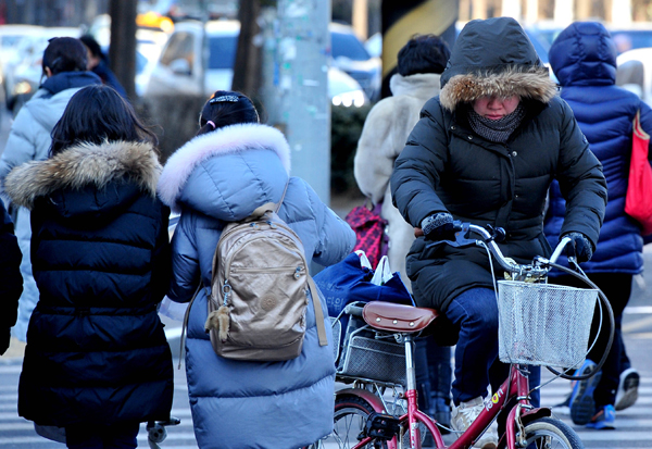 한파주의보가 발령된 5일 오후 수원시 한 횡단보도에서 시민들이 중무장을 한 채 지나고 있다. 수도권기상청은 이날 오후 10시를 기해 여주·안산·성남·광주·안성·이천·용인·하남·의왕·오산·구리·김포·시흥·과천 등 경기도 14개 시·군에 발효 중이던 한파주의보를 한파경보로 대치한다고 밝혔다. /김수연기자 foto.92@