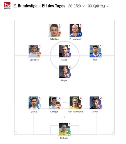 백승호(다름슈타트)가 독일 축구전문지 키커가 선정한 2019~2020 독일 분데스리가 2부리그 33라운드 베스트 11에 뽑혔다.