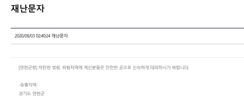 연천군은 이날 새벽 재난문자에서 '차탄천 범람, 위험지역에 계신 분들은 안전한 곳으로 신속하게 대피하기 바란다'고 알렸다.