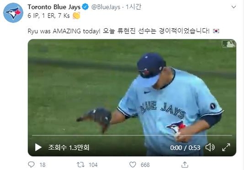 토론토 구단은 류현진의 투구 영상과 기록을 소개한 뒤 한글로 "오늘 류현진 선수는 경이적이었습니다!"라는 글과 함께 태극기 이모티콘을 올려 눈길을 끌었다.