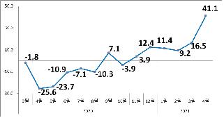 코로나19가 본격적으로 영향을 미치기 시작한 지난해 4월 26% 가까이 급감했던 수출 증가율은 1년 만에 41.1%로 반등했다.