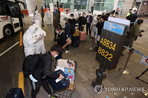 현지에서 실시간 유전자 증폭(RT-PCR) 방식 코로나19 검사를 받았던 교민들은 착륙 후 체온 측정 등 추가 증상 확인을 거쳐 11시 16분께 입국장 게이트로 나왔다.