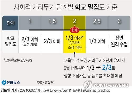 기존 거리두기 단계에 따른 학교 밀집도는 ▲ 1단계 3분의 2 이하 원칙이나 조정 가능 ▲ 1.5단계 3분의 2 이하 ▲ 2단계 3분의 1 이하 원칙(고교는 3분의 2 이하)이나 3분의 2까지 조정 가능 ▲ 2.5단계 3분의 1 이하 ▲ 3단계 전면 원격 수업으로 규정됐다.