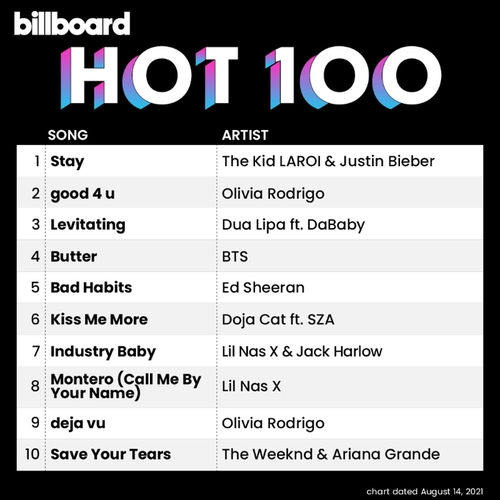 한편 이번 주 핫 100 1위는 호주 출신 신예 래퍼 더 키드 라로이가 저스틴 비버와 함께 부른 '스테이'(Stay)가 차지했다.