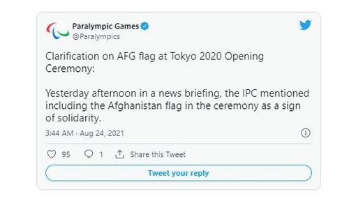 AP 통신 등 외신에 따르면 앤드루 파슨스 국제패럴림픽위원회(IPC) 위원장은 23일 기자회견을 열고 "'연대의 메시지'로 도쿄 패럴림픽 개회식에서 아프가니스탄 국기도 입장하게 될 것"이라고 밝혔다.