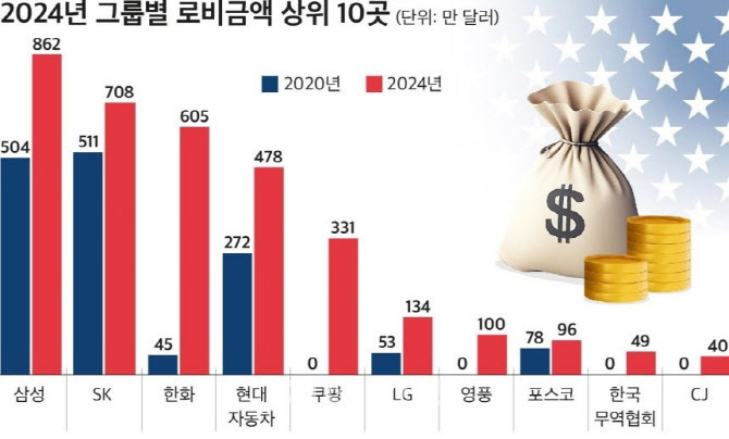 지난해 기준 로비 지출이 100만 달러 이상인 그룹은 삼성, SK, 한화, 현대차, 쿠팡Inc, LG, 영풍 등 7곳이었다. 삼성은 직접지출 606만 달러, 간접지출 256만 달러 등 총 862만 달러를 기록했다. SK는 708만 달러, 한화는 605만 달러, 현대차는 478만 달러를 각각 집행했다. 이어 쿠팡Inc(331만 달러), LG(134만 달러), 영풍(100만 달러) 순이었다.