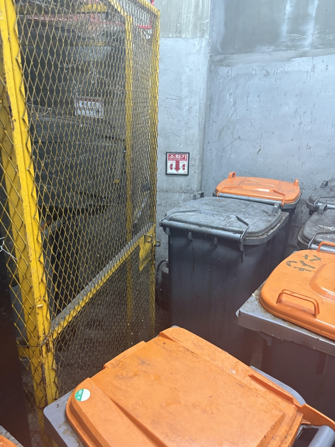 추석 연휴 첫날 찾은 죽전점 지하 하역장. 종이상자 더미와 음식물 쓰레기 수거함이 소화기와 화재 비상벨 앞을 막고 있었다. 일부 구역은 ‘소화기 위치’ 표지판만 붙어 있었고, 정작 소화기는 빠져 있었다.