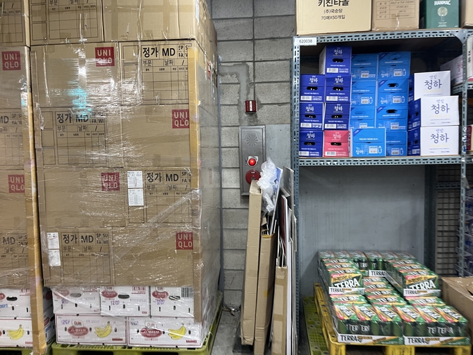 매장 내 방화셔터 주변에는 생수와 박스가 쌓여 있었고, 셔터 작동 구간에 진입로가 막힌 상태였다. 화재 발생 시 방화셔터가 제 기능을 하지 못할 가능성이 크다.