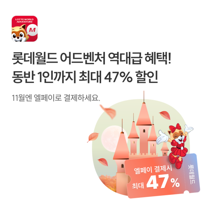 이번 프로모션은 롯데월드 어드벤처 종합 이용권을 엘페이로 결제한 선착순 7000명에게 본인 및 동반 1인까지 최대 47%의 할인 혜택을 제공한다. 엘포인트 회원이라면 누구나 참여할 수 있으며, 엘페이 결제 시 자동으로 할인 금액이 적용된다. 성인 기준 1일 종합 이용권은 3만 3900원, 오후 4시 이후 입장권은 2만 7500원에 구매 가능하다.