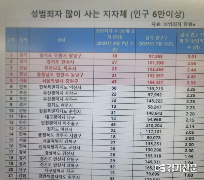 안성시가 인구 대비 성범죄자 비율에서 전국 상위권을 기록했다.